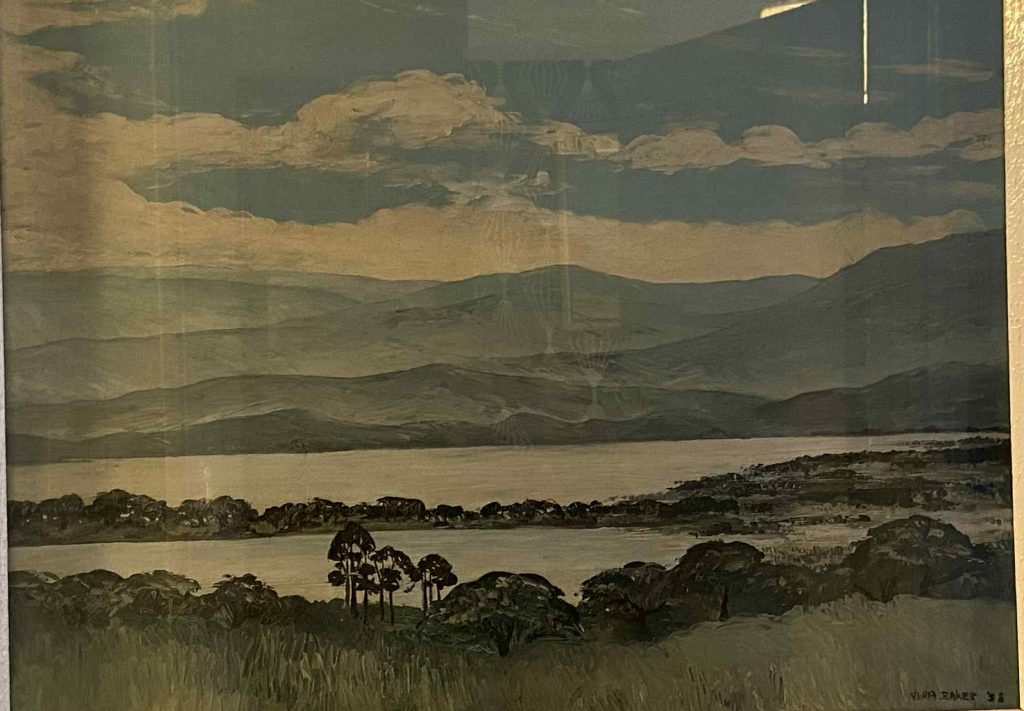 This is an extract of a letter written by my Mum, Annette to her cousin M and his wife P having taken journey in his plane “Jack” from their farm Karamaini in Thika. It is dated 21st February 1994. The painting is by Vera Baker dated ’58 and shows Crescent Island which divides the crater from the lake with the Kinangop on the horizon, most likely bought at The Bell Inn which is found on Moi Avenue in Naivasha town.